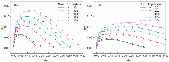 Experimental and numerically calculated trajectories of the artificial upwelling plume: (a) tests 101~105; (b) tests 201~205.