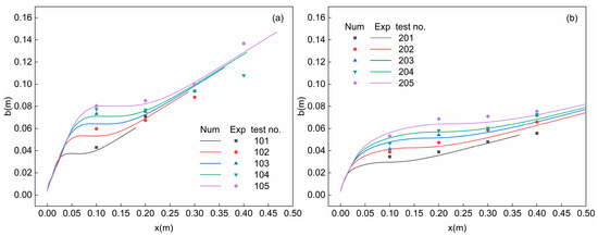 Experimental and numerically calculated half-width of the artificial upwelling plume: (a) tests 101~105; (b) tests 201~205.