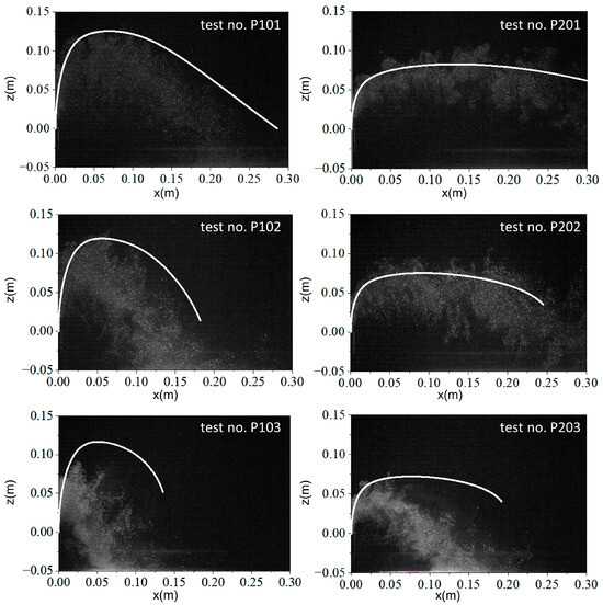 The particle sizes in Figure 8 range from 0.07 mm at the top to 0.1 mm in the middle and 0.125 mm at the bottom, exhibiting a gradual increase in brightness within the image. Another factor that contributed to the augmented brightness was the utilization of a basic funnel for particle release during the experiment, a method that may have led to an increased particle concentration. For tests p101, p102, p201, and p202, the numerically calculated particle trajectories all correlated well with the actual particle dispersion. For tests p103 and p203, on the other hand, the actual particle dispersion deviated from the mean trajectory to a greater extent, probably due to the high particle concentration, which led to the excessive influence of particle–particle interaction and particle motion on the plume flow field. Improved particle release methods are needed to address this issue. Even if the turbulence effect has a large influence on particle transport, the particle mean trajectory can still be used as an important reference for the design of engineering applications.