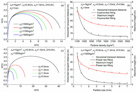 As illustrated in Figure 9a, increased particle density led to a shorter traveling distance of particles. This implies that higher particle density made it more difficult for particles to track the plume, decreasing their horizontal transport distance and maximum height. Figure 9b illustrates how the plume-driven particle horizontal transport distance and maximum height varied with an increase in particle density from 1100 kg/m3 to 2500 kg/m3. Particles with minimal density could ascend to 4.5 m and traverse horizontally for a considerable 77 m. Conversely, particles with the maximal density underwent a vertical ascent of 2 m and exhibited a meager horizontal transport distance of merely 5.9 m. The correlation between the horizontal transport distance of particles and particle density generally aligned with an exponential function that was similar for the maximum height.