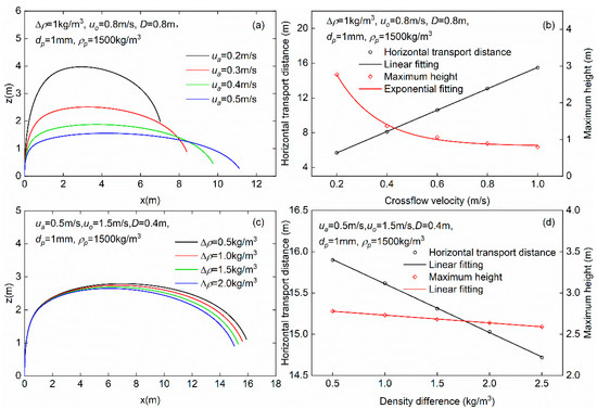 Effect of environmental conditions. (a) Trajectories of particles at different crossflow velocities. (b) Effect of crossflow velocity on plume-driven horizontal transport distance and maximum height. (c) Trajectories of particles with different density differences. (d) Effect of density difference on plume-driven horizontal transport distance and maximum height.