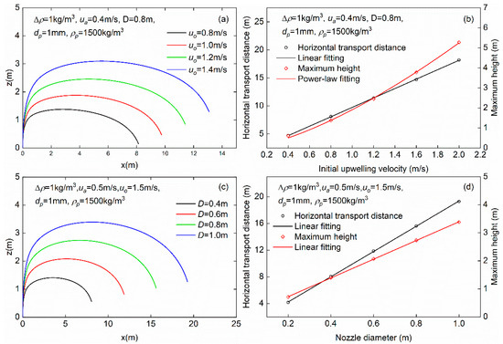 The trajectories of the same particles at different initial upwelling velocities are shown in Figure 11a. By increasing the initial upwelling velocity, the plume could lift the particles higher and transport them farther. Figure 11b examines the effect of initial upwelling velocities of 0.4~2 m/s. With the augmentation of the initial upwelling velocity, the maximum height demonstrated power law expansion, whereas the horizontal transport distance manifested linear progression. Under the conditions depicted in Figure 11b, particles with a 1 mm size required a minimum initial upwelling velocity of 1 m/s to be transported beyond 10 m and at least 1.6 m/s to be transported beyond 15 m.