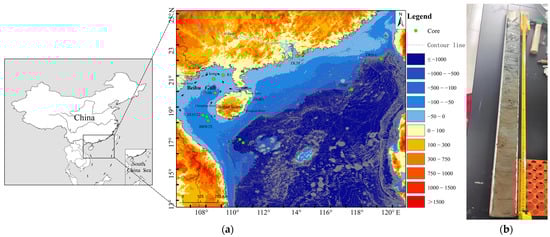 As part of the South China Sea, the largest marginal sea in the western Pacific, the Beibu Gulf preserved information on changes in the marine environment with sediments since the late last glacial maximum (LGM), and its deposition processes are highly impacted by land–sea interactions, sea-level changes, East Asian monsoons (EAMs), and other processes. The Beibu Gulf, located on the northwestern edge of the South China Sea, is a semi-enclosed bay with an area of approximately 12.93 × 104 km2, an average depth of 42 m, and a maximum depth of 100 m. It is located in the shelf area of the South China Sea and is connected to this sea through the Qiongzhou Strait. Due to its unique geographical location, diverse seabed topography, and complex ocean currents and hydrodynamic environment, its marine sediments preserve rich paleoclimatic information in East Asia [,,,,,,,,,,].