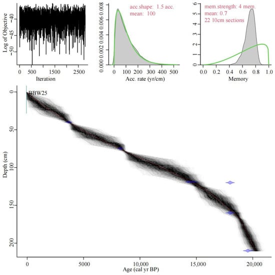 - Blaauw, M.; Christen, J.A. Flexible paleoclimate age-depth models using an autoregressive gamma process. Bayesian Anal. 2011, 6, 457–474. [Google Scholar] [CrossRef]