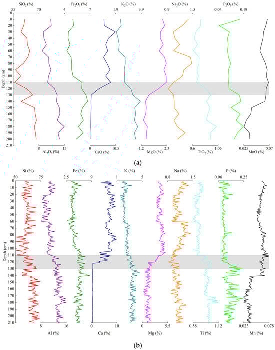 Contents of major elements in core sediments also show a similar age-depth model pattern to that in the upper and lower profiles. Contents of major elements vary with the burial depth as shown in Figure 3. Among them, CaO and MgO contents exhibited patterns similar to those in the upper and lower sections in the age framework. The average content is ranked as SiO2 > Al2O3 > Fe2O3 > CaO > K2O > Na2O > TiO2 > P2O5. Among them, the SiO2 content range is 50–70%; Al2O3 content is 8–15%; Fe2O3 content is 3–7%; CaO content is 0.2–8.5%; K2O and MgO content is 1–4%; Na2O content is 0.9–1.3%; TiO2 content is 0.6–1.1%; P2O5 content is 0.09–0.2%; and MnO content is 0.02–0.07%. Figure 3a shows the results of the ICP-MS tests, which were performed at 10 cm intervals, for a total of 20 samples tested. Figure 3b shows the results of the XRF tests, which were performed at 1 cm intervals, for a total of 210 samples tested.