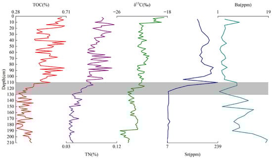 Organic matter proxies and the content of Sr and Ba in the core sediments also show a similar age-depth model pattern to that in upper and lower sections. The variation in organic matter content with burial depth is shown in Figure 4, with a similar pattern of upper and lower sections in the age framework. The TOC content range of core sediment was 0.28–0.71%; TN content was 0.03–0.12%; and δ13CV-PDB (hereafter abbreviated as δ13C) content ranged between −25.5 and −18.54‰. Organic matter was tested at 2 cm intervals and a total of 105 samples were tested. The Sr content range of core sediment was 7–238.8%; and Ba content was 1.5–18.63%. Sr and Ba were tested at 5 cm intervals and a total of 42 samples were tested.