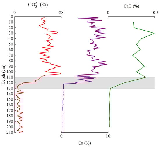 The carbonate content in the core sediment also shows a similar age-depth model pattern to that of the upper and lower sections. The variation in carbonate content with depth is shown in Figure 5. During the hydrochloric acid dissolution process of the organic matter pretreatment in core sediment, the mass of escaped CO2 can be derived by calculating the change in sample mass before and after the hydrochloric acid dissolution. Through calculating the mass of emitted CO2, we can calculate the percentage of CO32 and CaCO3 in the sample. The variation trends of the three groups of data are relatively similar when comparing the CO32 content with the CaO and Ca contents measured by ICP-MS and XRF, respectively. Thus, it can be concluded that carbonate mostly existed in the form of calcium carbonate in the sediment. Due to significant errors, the XRF test results had to be corrected. Figure 5 shows that the Ca contents in sediments were relatively high with significant changes. Thus, the relative error can be ignored. Also, Figure 5 indicates that the XRF and ICP-MS test results have consistent changes, proving a good correspondence between the results. Therefore, in this study, the ICP-MS test result data are used to calibrate XRF test result data.