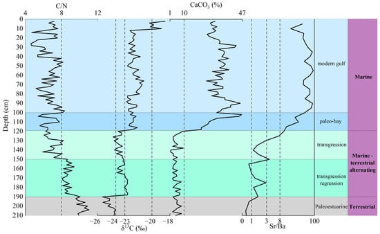 Based on the “jump” in calcium carbonate content, combined with the phased variation characteristics of C/N, Sr/Ba, and δ13C (Figure 6 and Figure 7), the evolution of the sedimentary environment in the Beibu Gulf was divided into the following three sedimentary environments and five sedimentary sub-environments: