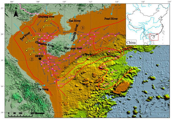 Source-to-sink processes in the northwestern part of South China Sea [,]. (1) Source: the starting point of the blue arrow is the source of terrigenous clastic sediments; (2) channel: the gray arrow direction is the main sediment transport direction and its pathway; (3) sinks: the circle number is the sedimentary block number: ① Beibu Gulf Basin; ② Yinggehai Basin; ③ shallow shelf around Hainan Island; ④ Qiongdongnan Basin; ⑤ Pearl River Estuary Basin; ⑥ Xisha Trough; ⑦ Sea Basin. (4) Black spot: BBW25 core; (5) yellow spots: STAT cores; pink stars: PC cores.