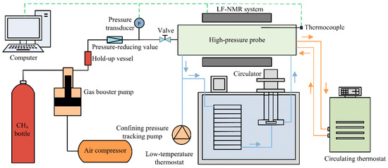 The hydrate formation experiments were carried out by using the low-field NMR test system (Figure 1). The system mainly consists of a low-field NMR analyzer, a low-temperature and high-pressure probe module, a gas injection module, a temperature and pressure control module, and a data acquisition module. The low-field NMR analyzer (MesoMR23-060H, Suzhou Niumag Analytical Instrument Corp., Suzhou, China) can perform the TD-NMR analysis and the MRI measurement on test samples. The type of magnet is a permanent magnet. The magnetic field strength is 0.52 ± 0.05 T. The working temperature of the magnet is 32 ± 0.1 °C. The imaging gradients in X, Y, and Z directions can be independently amplified, with a gradient peak of 5 Gauss/cm [37].