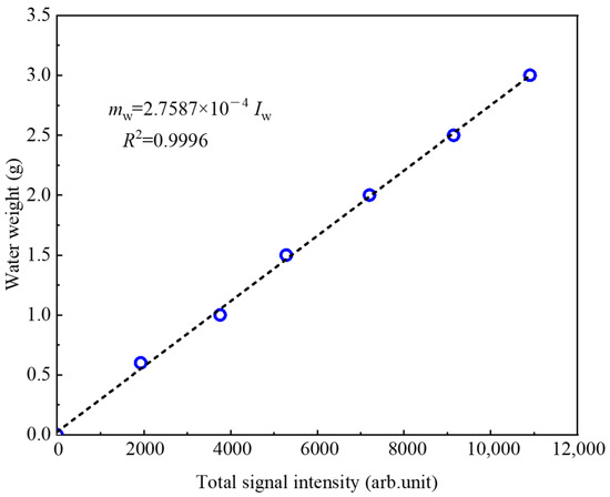 Data processing methods are introduced by taking Experiment 2 as an example. As outlined above, the pore water content can be determined by the total signal intensity in the T2 distribution of the sand sample [22]. Based on the calibration curve, the water content is directly proportional to the total signal intensity of T2 distribution (Figure 4). In Experiment 2, the water content calibration equation is provided by Equation (5):