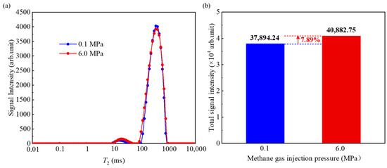 As shown in Figure 5a, there are slight differences in the T2 distribution range, peak area, and peak value between before and after gas injection in Experiment 2. The total signal intensity of T2 distribution increases by 7.89% after filling 6.0 MPa methane gas injection (Figure 5b). If the NMR signal intensity of 1H in methane gas is directly ignored, it will cause a significant error.