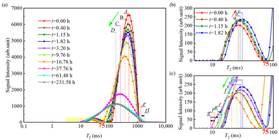 Figure 7 presents the variation of T2 distributions during methane hydrate formation in Experiment 4. Based on the principle that the T2 of pore water is directly proportional to the pore radius r (shown in Equation (4)), the pores with T2 ≤ 75 ms are defined as small pores, and those with T2 > 75 ms are defined as large pores in this study. Results show that the large pore peak of T2 distribution shifts to the left along the horizontal axis with the hydrate formation, and the signal intensity at the peak point decreases continuously (A-B-C-D, shown in Figure 7a). This phenomenon indicates that the pore water in large pores gradually converts into hydrates. The decrease in pore water content results in a decrease in the signal intensity at the peak point. The hydrates formed in large pores occupy a part of the pore space to reduce the pore size. The reduction of pore size causes the large pore peak to shift to the left.