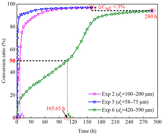 Figure 10 presents the variation of the pore water conversion ratio during methane hydrate formation under different sand particle sizes in Experiments 2, 5, and 6. Results indicate that the time required for the conversion ratio of pore water to reach 50% gradually increases as the sand size increases (t5 < t2 < t6, shown in Figure 10 and Table 2). This illustrates that the conversion rate of pore water slows down with the increase in sand size. Furthermore, the conversion rate of pore water in Experiment 6 (ds = 420–590 μm) is significantly lower than that in Experiment 2 (ds = 100–200 μm) and Experiment 5 (ds = 58–75 μm). It takes 105.65 h to achieve a 50% conversion ratio of pore water in this experiment. The specific surface area of sand particles is inversely proportional to the particle size. Therefore, the contact area between methane gas and water is less in the coarser particle sample at a similar initial water saturation. It results in a slower conversion rate of pore water in the coarser particle sample. In addition, the hydrate film formed on the gas–water interface can block the contact between methane gas and the water layer on the particle surface [60]. Due to the smaller contact area between methane gas and water, the hydrate film is thicker at the same hydrate saturation in the coarser particle sample. The barrier effect of hydrate film is stronger. It takes a longer time to achieve the same conversion ratio of pore water. Besides those, the decrease in a specific surface area will also reduce nucleation sites on the surface of sand particles. The potential of hydrate formation will decrease [58].
