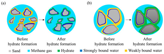 Schematics before and after hydrate formation under different sand particle sizes: (a) fine-grained sand; (b) coarse-grained sand.