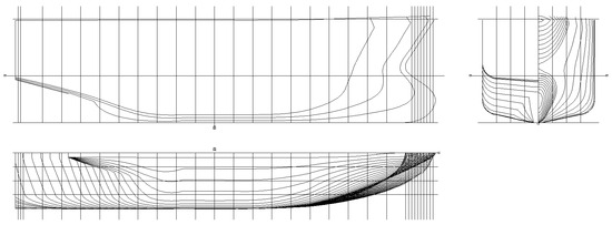 A typical Argentinian fishing vessel was chosen for this study. The model was constructed at a scale of = 20 by using glass fibre-reinforced plastic (GFRP), following the ITTC-recommended procedure [14]. Two 1.0 mm diameter tripwires were used to induce turbulence. One was positioned downstream of the forward perpendicular at a distance equal to five percent of . The other was placed downstream of the front end of the bulb at a distance equal to one-third of the bulb length. Table 1 shows the main characteristics of both the full-scale ship and the model. Three loading conditions (LCs) were studied: ballast (T1), intermediate loading (T2) and full loading (T3). The main characteristics of the full-scale ship are given for reference purposes only for the ballast condition (T1). Figure 1 shows the body lines of the hull.