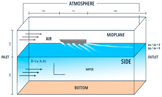 When numerically calculating the ship’s resistance, the governing equations must encapsulate Newtonian, turbulent, incompressible and viscous flow characteristics. The Navier–Stokes equations, which include mass (1) and momentum (2) considerations, form the cornerstone. The Reynolds-Averaged Navier–Stokes (RANS) method, specifically the SST k- model, has been used to treat turbulence. This model, with two eddy viscosity equations, has been shown to be effective in previous studies [17].