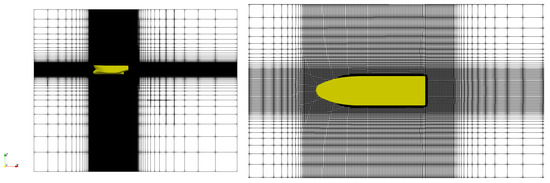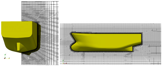 Figure 3 and Figure 4 illustrate the resulting mesh configuration, characterised by horizontal expansion ratios of 1.3 and 1.2 along the x- and y-axes, respectively, together with a vertical expansion ratio of 1.2, all converging towards the central zone. The vessel was enclosed within a block composed primarily of hexahedrons with an aspect ratio of one, except in the interface zone, where cell heights were reduced by 25% to accurately capture wave characteristics. The mesh design prioritises maintaining a y+ value below 5 in all scenarios. To achieve this, the snappyHexMesh layers tool was used to surround up to 98% of the hull surface with prismatic layers. The chosen wall function ensures that the correct function is used according to the y+ value found, whether it is in the viscous or logarithmic sublayers.