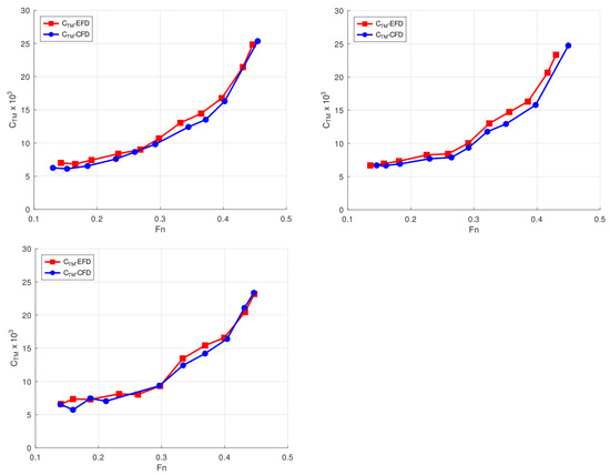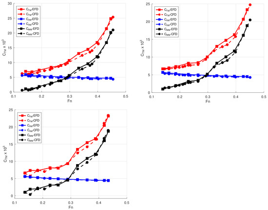Figure 11 illustrates the numerically and experimentally obtained curves of , and (calculated as ) versus Fn for different draughts. The form factor (k) used in the EFD curves is the one derived from the experimental data (see Section 4.3), while the k used in the CFD curves is the one obtained numerically with Fn = 0.1 (see Section 4.4). In both cases, corresponds to the ITTC-57 friction line.