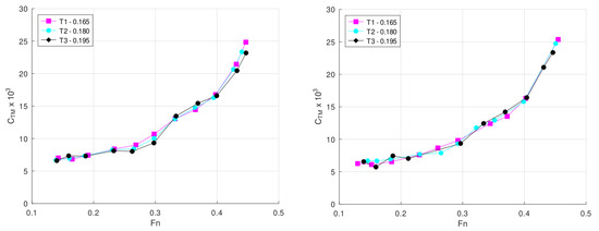 Figure 6 shows the -versus-Fn curves separately for EFD and CFD to emphasise the influence of draught on . The left graph shows the EFD drag results for different draughts, while the right graph shows the CFD model results.