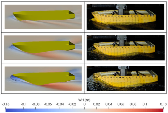 From the above observations, it is clear that wave resistance plays a crucial role in assessing the performance of this type of fishing vessel. Therefore, understanding the wave pattern across the hull of a vessel is essential to designing and operating efficient vessels. Figure 7 shows a comparison of the wave pattern distribution along the hull obtained with the CFD model and EFD, for draught T3 with different Fn values. The three cases illustrate the ability of the CFD model to reproduce the wave pattern generated by the ship for different Fn values.