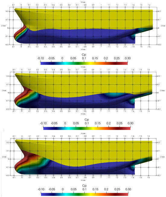 The validation of the CFD model allows for the determination of variables that would be difficult to obtain by using EFD techniques. For example, directly related to the wave resistance phenomenon is the pressure distribution on the hull. Figure 8 shows the dimensionless pressure distribution () on the hull for different Fn values at T3. This dimensionless parameter is defined as