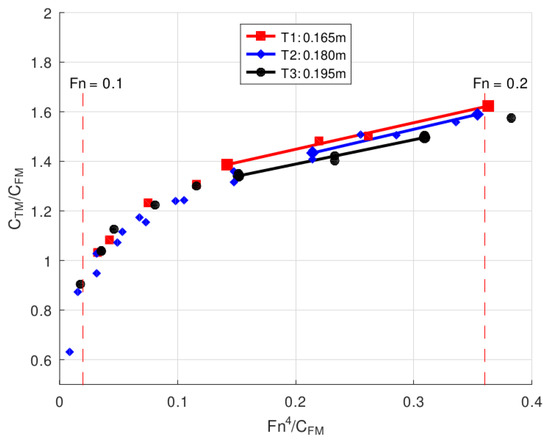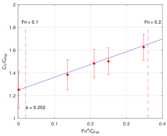 It is worth noting that at very low values of Fn, the measured points deviate from a straight line, making it necessary to select an appropriate data set for each draught to determine the form factor. Figure 10 shows straight lines indicating the resulting slope to determine the form factor for each draught. These lines also delineate the Fn range considered in each case. Similarly to Figure 9, the dashed red vertical lines indicate the limits of the Fn range as [0.1, 0.2].