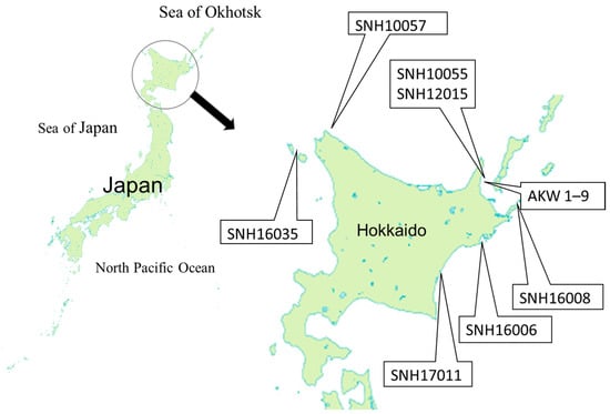 Muscle samples from killer whale calves (SNH 16006 and SNH 16035), a mature male animal (SNH 16008), and a mature female animal (SNH 17011) stranded on the coast of Hokkaido, Japan in 2016 and 2017 were obtained from SNH (http://www.kujira110.com/ accessed on 30 March 2024). Liver samples from one calf (SNH 16006) and both mature whales (SNH 16008 and SNH 17011) were also obtained from SNH. These samples were quantified with the δ13C, δ15N, and δ18O values and the mercury concentrations. All killer whale data from the previous and current studies are summarized in Table 1, and stranding locations from both studies are presented in Figure 1. The ecotypes of all SNH whales in both studies are unidentified.