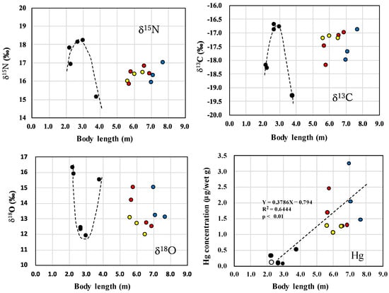 We investigated whether the relationship between BL and analytical data (δ13C, δ15N, and δ18O values and Hg concentrations) could be fitted by a linear or exponential function using JMP (SAS Institute Japan Ltd., Tokyo, Japan, version 14.3). The data were analyzed by Student’s t-test and presented as the mean ± SD. The level of significance was set at p < 0.05.
