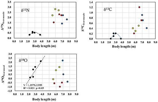 As observed for muscle samples shown in Figure 2, the δ15N, δ13C, and δ18O values in the liver samples from calves (n = 5) were significantly fitted to quadratic functions. As data are not shown in figure, the δ15N-enriched peak was located at BL of 2.9 m and δ15N value of 18.8‰ (F = 705.41, R2 = 0.9986, p = 0.0014), and the δ13C-enriched peak was located at BL of 2.9 m and δ13C value of −16.5‰ (F = 143.64, R2 = 0.9930, p = 0.0069). Meanwhile, the δ18O-depleted peak was located at BL of 2.9 m and δ18O value of 12.9‰ (F = 23.406, R2 = 0.9590, p = 0.0410). These BLs of the δ15N, δ13C, and δ18O peaks calculated in liver samples (2.9 m) were extremely close to those calculated in muscle samples (2.7–3.0 m).