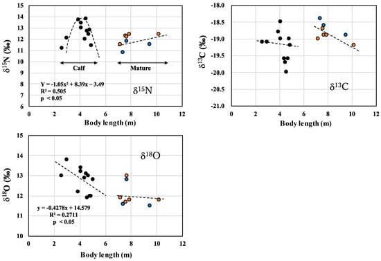 Mature males had longer BLs (7.0–7.7 m, n = 3) than mature females (5.6–6.9 m, n = 7) (Table 1), and these ranges were consistent with the reported BLs of killer whales of mature males (6–8 m) and mature females (5–7 m), respectively []. The relationships of BL with δ13C, δ15N, or δ18O values in muscle samples from calves and mature animals are shown in Figure 2.