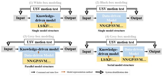 White-box modeling has been rapidly researched and widely used for a long time. In this approach, models are meticulously crafted based on known kinematic and kinetic theories. These models account for a range of factors affecting a USV, such as hydrodynamic forces, control forces, and environmental disturbances. Notable models in this category include the first-order Nomoto model [16], the Abkowitz model [17], a mathematical maneuvering model [18], the Manoeuvring Modeling Group (MMG) model [19], and a six degree-of-freedom (six-DOF) nonlinear kinetics model and its deformation models [20,21]. The structures of these models are well-defined, and unknown parameters can be obtained by various system identification methods. One of the most popular parameter identification methods is the Kalman filter (KF) [22,23] and its variants, such as the extended Kalman filter (EKF) [24,25] and the unscented Kalman filter (UKF) [26,27,28]. Another popular method for parameter identification is the least squares (LS) method [29,30,31,32]. White-box models are typically derived from expert knowledge; however, partial studies tend to oversimplify specific dynamic properties or assume that the USV system operates under time-invariant conditions (in calm waters) [14,33]. Furthermore, the model’s effectiveness is often constrained by the researchers’ limited prior physical knowledge of the USV’s dynamic characteristics, as well as their observational capacity during maneuvering. These limitations can compromise the model’s accuracy and adaptability to changes in both internal states and external environmental factors, such as payload variations, structural changes, wind, waves, and currents [34].