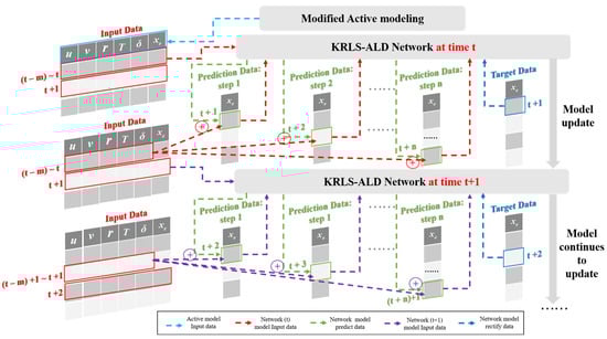 We propose the GBM-ILM method with a novel hybrid modeling framework, outlined in Figure 2, which aims to guarantee both the physical rationality and accuracy of the USV kinetic model. The flow graph of this modified active modeling and incremental learning network based on KRLS-ALD is divided into two parts. In Part I, we introduce a modified active modeling framework, where a structured model is fixed, building on previous research in Section 3.1. The onboard computer and operator can relay desired commands to drive the practical USV system. Simultaneously, multiple sensors attached to the USV continuously measure real-time position and attitude data, the mechanism model also estimates an idealized USV state obtained, and the unforeseeable model error is calculated in this framework, as described in Section 3.2.1. Part II delves into the KRLS-ALD network model, which fits and estimates the model error from Part I. The parameters and structure of this network model are designed to be incrementally updated, as described in Section 3.2.2. This network model can update its structure and parameters by learning new kinds of data from changeable environments and USV states. The dotted line of each color describes how training and testing datasets are transferred from the active modeling framework to the network model. This method provides the USV states, USV control commands, and model errors as input data, with the model error serving as the target data for network training. The input dataset comprises either a set of synchronous values or a series of consecutive historical moments, as described in Section 3.2.3. With the training of this network model, its ability to predict the model error is gradually enhanced; this incremental learning strategy thrives even with limited samples, unlike other traditional machine learning theories, which rely on large sample sizes. As both the USV system and its environment change, the amount of data increases, and the network model keeps constantly updating.