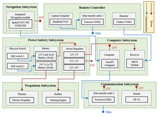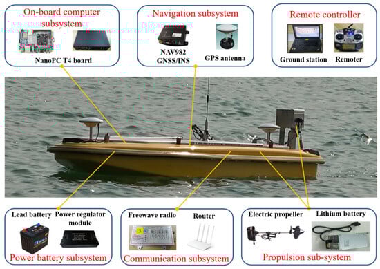 Built with a modular design, each subsystem is responsible for different working tasks; the developed USV experimental platform is shown in Figure 5. The hardware system mainly comprises six main subsystems: (1) onboard computer, (2) navigation, (3) remote controller, (4) power battery, (5) communication, and (6) propulsion.