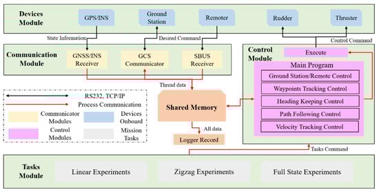 To ensure precise navigation capabilities for the USV in open water areas, we designed multiple control strategies for the hardware system, all running within the Ubuntu operating system on the USV’s computer subsystem. Following the modular, multithreaded design ideology, the software system is organized into the following four main parts: (1) the tasks module, which defines detailed action plans for each identification task; (2) the control module, which serves as the highest level of the software structure; (3) the communication module, which is responsible for linking sensors, controllers, and equipment; and (4) the devices module, which includes both navigation and control hardware. The software structure of the developed USV is graphically described in Figure 7.