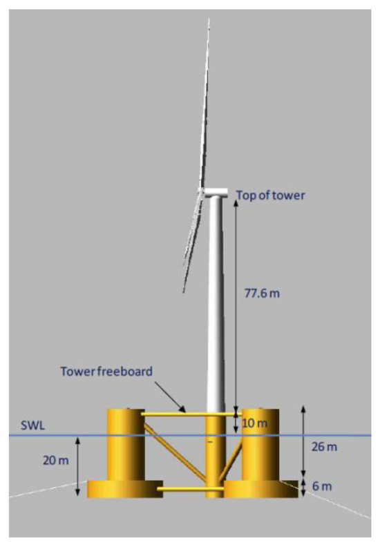 The semi-submersible floater of the OC4-DeepCwind developed by National Renewable Energy Laboratory (NREL) is used as the study object in this work [41]. As shown in Figure 2, the platform consists of a main column attached to the tower and three offset columns connected to the main column through a series of pontoons and cross members. The NREL 5 MW baseline wind turbine [42] is supposed to be mounted on the central column.