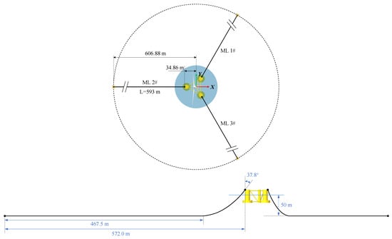 The water depth for OC4 semi-submersible by default is 200 m. Since the water depth along the eastern and southern coasts of China usually does not exceed 100 m, the mooring system of OC4 is modified as 50 m in this work, as shown in Figure 3. A substantial difference lies in that the fairlead location has been lifted to the top of the column, in order to achieve good mooring performances in waters with medium depth. The primary parameters for the mooring system are listed in Table 1.