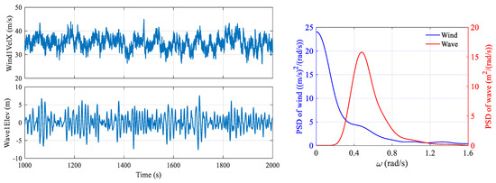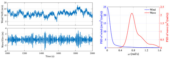 Time-series and power spectrum of wind speed and wave height under rated condition.