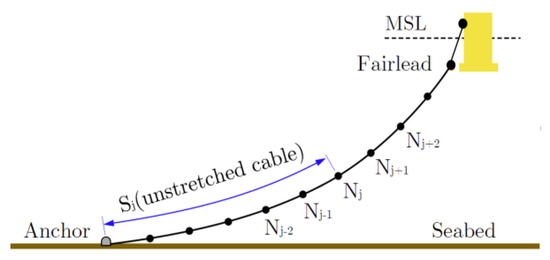The lumped-mass approach is adopted for modelling the FOWT mooring system. As a sub-module, MoorDyn in OpenFAST models the mooring dynamics based on a lumped-mass discretisation of a mooring line’s dynamics and adds point-mass and rigid-body objects to enable simulation of a wide variety of mooring and cabling arrangements. The dynamic nonlinear catenary mooring line model is established as multi-segment elastic catenary lines with several sections and clump weight, which is illustrated in Figure 6.