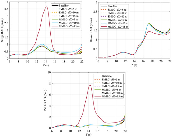 The RAO results for different mooring length configurations are shown in Figure 7. It can be noted that the MMLC with 15 m has led to large peaks for surge and pitch motion, as the mooring lines have become taut in this scenario. In comparison, there are no significant differences between the baseline system and the re-configured mooring design.