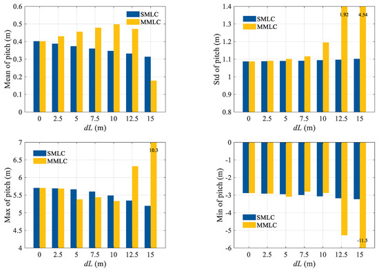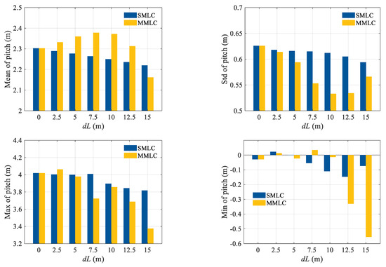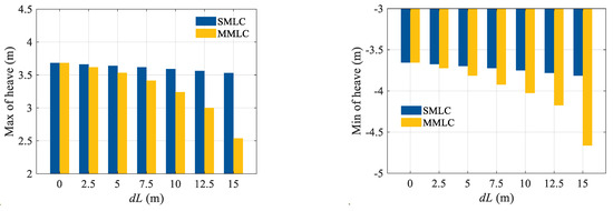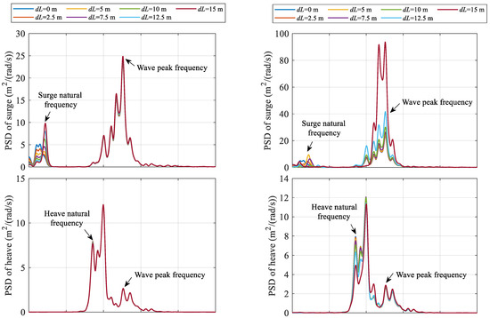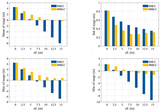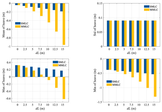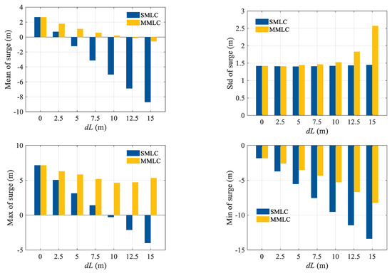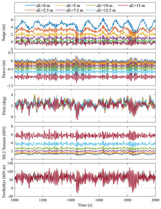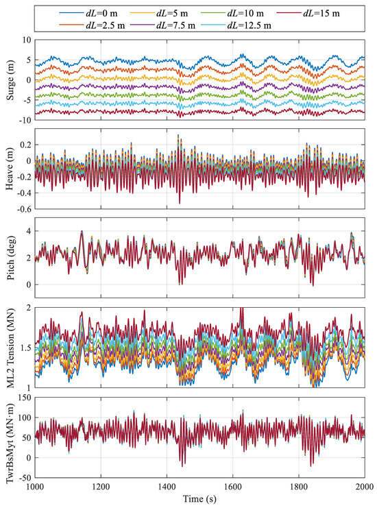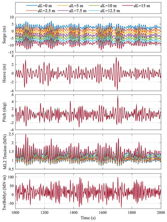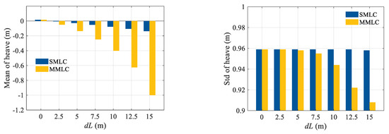 Regarding the SMLC, the ML2 attached to the upwind column is reeled in. In this paper, dL is defined as the reel-in length, e.g., dL = 5 m means the mooring is reeled in 5 m. It is shown in Figure 8 and Figure 9 that the SMLC has a significant impact on the average surge position, which changes from 4.50 to −7.97 m by retracting the mooring length for 15 m. At the same time, heave and pitch motion does not show any noticeable differences. In contrast, for MMLC, all the three moorings are reeled in at the same length, such that surge motion does not exhibit any large shifting, while the equilibrium heave position is decreased by 1 m.