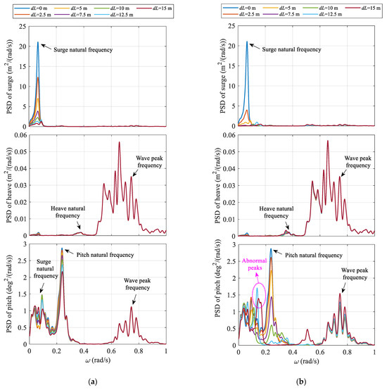 Power spectrum densities of platform motion with different mooring control configurations (rated). (a) SMLC (b)MMLC.