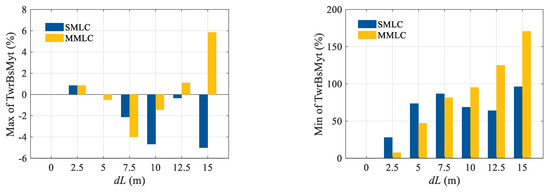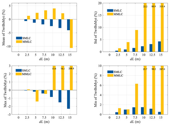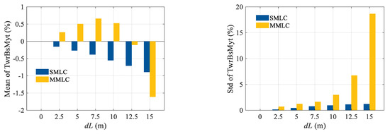 Tower-bottom fore-aft bending moments are also evaluated in order to check the mooring control influences on structural fatigue loads, and the statistical results for load reduction with different mooring length configurations are shown in Figure 14. Here, a positive number means load increment, while a negative number signifies a load reduction. It is seen that with the SMLC, the average bending moments increase negatively when the mooring lines are reeled in, while the load is increased first and then decreased for the MMLC. This phenomenon agrees well with the above statistical results for pitch motion. Regarding standard deviation, both the SMLC and MMLC will worsen the results, which may be harmful to the tower-bottom fatigue.