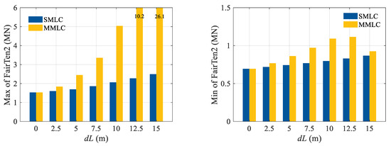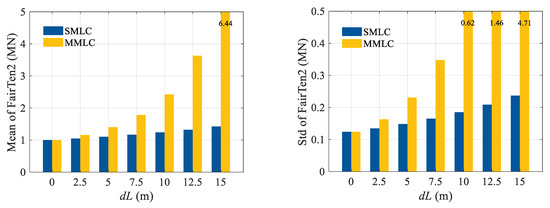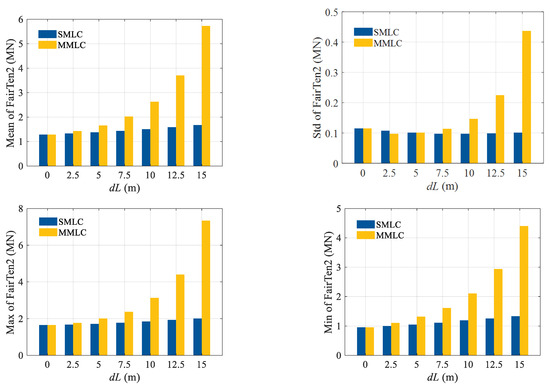 Statistical results of ML2 tensions are shown in Figure 15. It can be observed that the SMLC will not heavily affect the mooring loads, but the MMLC will cause a substantial increase in the mean values of mooring tensions. Regarding standard deviations, both SMLC and MMLC will lead to decreased oscillation first and rise again by increasing the retracted mooring length.