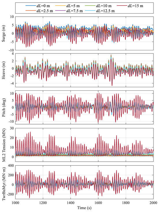 Regarding the extreme condition with 35 m/s turbulent wind speed, there will be less aerodynamic thrust on the rotor as the blades are all feathered, but the sea state will be much more severe. Similar to the rated condition, it can be seen from Figure 16 that the SMLC has a significant impact on the average surge position, which changes from 2.67 to −8.72 m by retracing the mooring length for 15 m. At the same time, heave and pitch motion does not show noticeable differences. For the MMLC as shown in Figure 17, again the surge motion does not exhibit any large shifting. However, the pitch motion is greatly increased, even reaching the amplitude of 10°. This will pose a risk to the safe operation of FOWT in extreme conditions. It is because the catenary moorings gradually become taut when the length of all mooring lines is reduced over 12.5 m, such that large mooring tension variations will increase platform pitch responses.