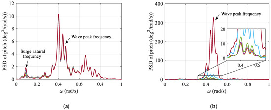 Power spectrum densities of platform motion with different mooring control configurations (parked). (a) SMLC (b)MMLC.