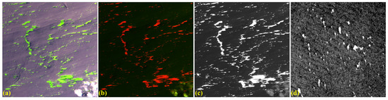 U. prolifera has similar spectral characteristics to vegetation. It appears green on true color images (a combination of red, green, and blue bands) and appears red on standard false-color images (a combination of near-infrared, red, and green bands), as shown in Figure 2a,b, respectively. Domestic and foreign scholars have proposed many algorithms for the remote sensing monitoring of U. prolifera, most of which use the spectral index method. The more commonly used ones include the normalized difference vegetation index (NDVI) [26], enhanced vegetation index (EVI), floating algae index (FAI) [27], alternative floating algae index (AFAI) [28], etc. The monitoring capabilities of the four commonly used spectral indices for U. prolifera were analyzed [29], and the results showed that the NDVI algorithm had the strongest monitoring ability for each stage of the U. prolifera disaster. The NDVI further amplified the difference in reflectivity of U. prolifera in the near-infrared and red bands (Figure 2c) and identified U. prolifera stably and reliably. This paper also used the NDVI index to extract U. prolifera, and its expression was as follows: