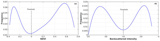 In SAR images, due to the difference in backscattering between U. prolifera and seawater, there is an obvious brightness difference (Figure 2d). Compared with seawater, U. prolifera has a higher backscattering intensity and has a brighter appearance on the image [31]. For high brightness, the maximum inter-class variance algorithm is also used to calculate the optimal threshold (Figure 3b) for adaptive U. prolifera extraction for a specific SAR image; the backscattered intensity segmentation threshold is shown in the Figure 3b.