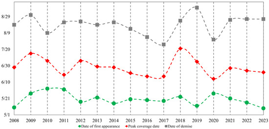 Series of green tide evolutionary key dates of U. prolifera in the Yellow Sea from 2008 to 2023.