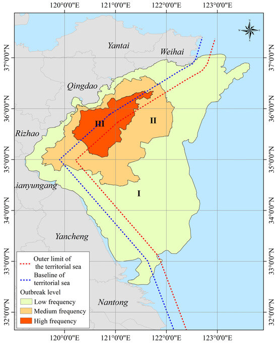 The overall outbreak sea areas over the years were mainly located between 33° and 37° N and west of 123° E, with the total affected sea area being 95,815 km2. According to the distribution frequency, the affected areas were classified into three grades. Area III was a high-frequency distribution, that is, 11 to 16 times, mainly located around the terrestrial sea baseline (dot-blue line in Figure 8) from Rizhao to Qingdao. The distribution of area III was 9050 km2, accounting for about 9.4%. Area II was a medium-frequency distribution, that is, 6~10 times, located in the seas on both sides of the terrestrial sea outer line (dot-red line in Figure 8) from Lianyungang to Yantai, with a sea area of 22,101 km2, accounting for about 23.1% of the total quantity. Area I was a low-frequency distribution, that is, 1 to 5 times, located in the sea areas from Yancheng to Weihai, with a sea area of 64,664 km2, accounting for about 67.5% of the total. The scope of the three divisions gradually shrank from the far sea to the offshore sea, and the level of impact gradually increased. It can be concluded that the coast from Qingdao to Yantai was the area most severely affected by U. prolifera.